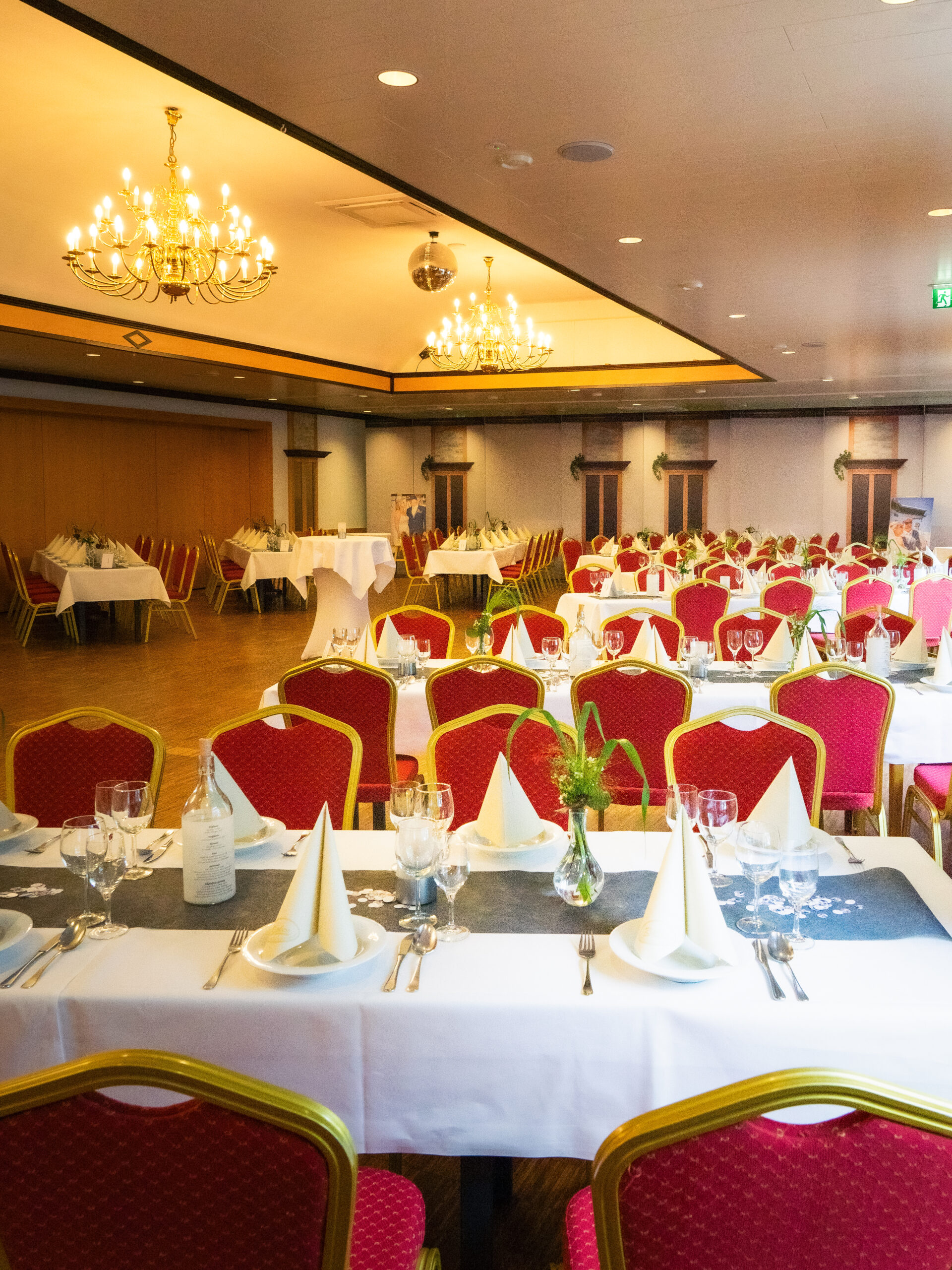 Der kleine Saal ist perfekt für Ihre Feier im familiären Rahmen. Von 30 – 70 Personen finden hier einen Platz. Sobald das fahrbare Buffet rausgefahren wurde, kann der DJ die Tanzfläche zum qualmen bringen.